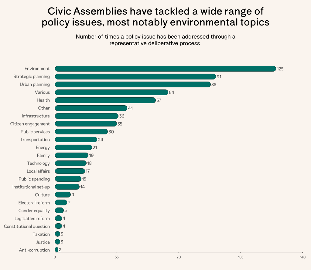 While assemblies have catalyzed climate action around the world, there have been over 700 examples worldwide addressing a variety of civic challenges, such as affordable housing, health care, education, and even constitutional reform on marriage equality and reproductive rights.